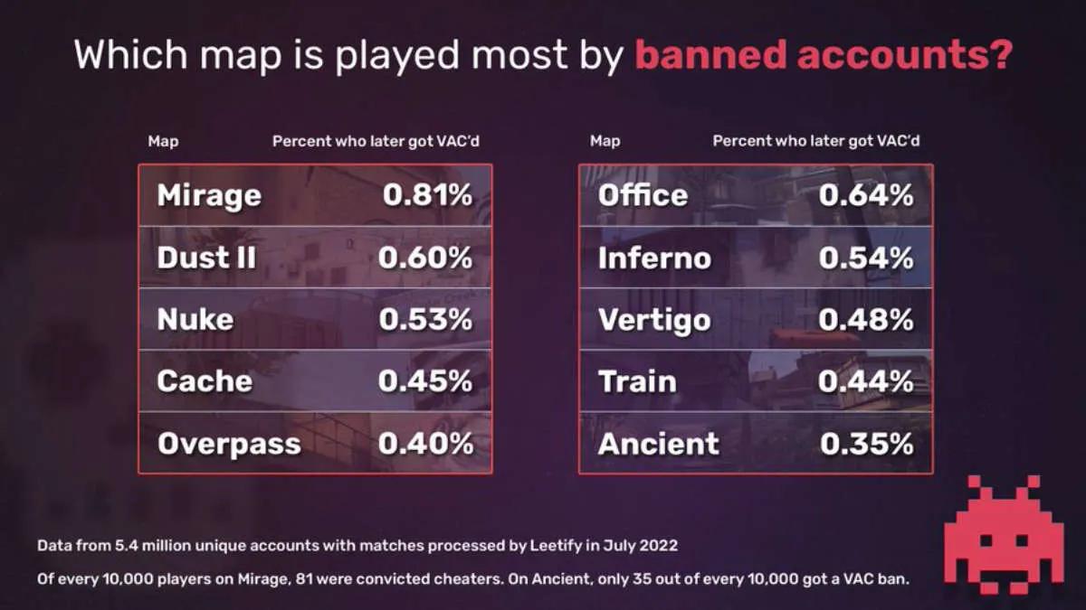 Mirage, Dust 2 and Nuke maps are the most popular among cheaters