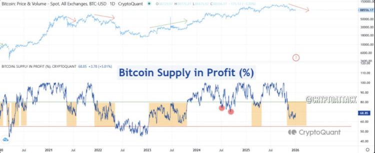The current Bitcoin price is hovering around $90,000, closing at $90,106.76 yesterday, indicating stabilization after a volatile 2025. Traders are watching for a potential "anniversary rally," as historically January often brings positive momentum for BTC. However, on-chain metrics paint a cautious picture. The Supply in Profit (%) indicator is a metric that measures the share of BTC supply that is in profit, comparing the current price to the price of the last coin movement. Currently, this indicator stands at 68.85%, placing the market in a transitional phase (55%-80%), typical for late stages of the cycle. This is not a short-term correction but a prolonged decline over several months, starting from October 2024, signaling accumulated market fatigue. Internal indicators are gradually weakening, while macro conditions - ongoing geopolitical risks, the growing appeal of safe-haven assets like gold and government bonds, continue to pressure risky assets, including cryptocurrencies.